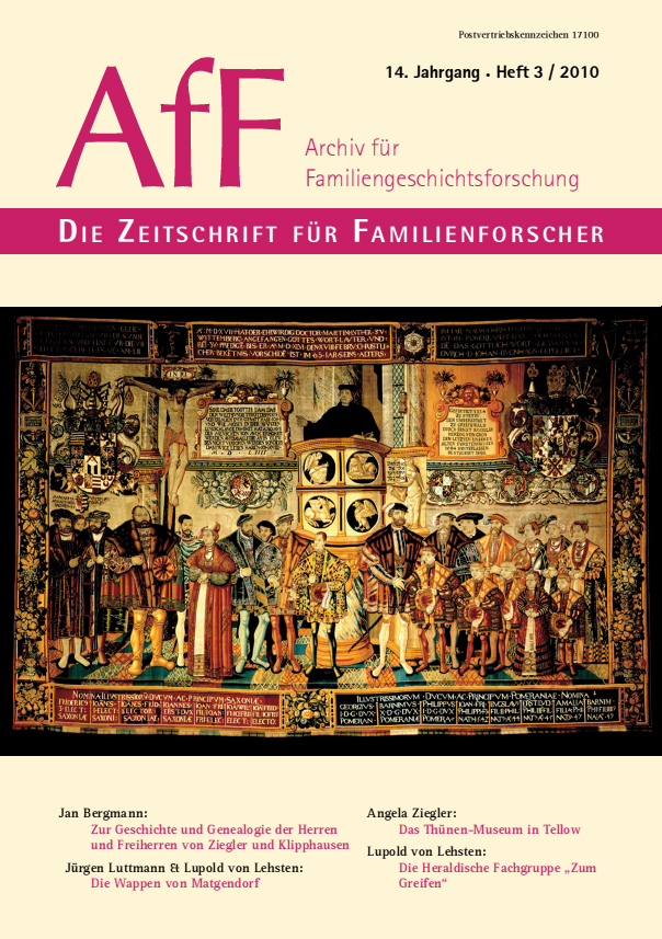Editorial. S. 82-83 Aufsätze: • Hans-Cord Sarnighausen: Hannoversche Amtsjuristen von 1719 bis 1866 in Rotenburg/Wümme (Fortsetzung). S. 84-88 • Jan Bergmann: „Kliphausen heis ich, in Gotes Hant ste ich, wer mich hast, der meidi mich“ – Zur Geschichte und Genealogie der Herren und Freiherren von Ziegler und Klipphausen. S. 89-96 Heraldik unter der Lupe: • Jürgen Luttmann & Lupold von Lehsten: Die Wappen von Matgendorf. S. 97-102 Mitteilung: • Lupold von Lehsten: Die Fragen der Arbeitsziele und der Satzung der DAGV bis zur ersten beschlossenen Satzung 1964. S. 103-105 Für Sie geklickt: • „Landeskunde im Netz“ in Hessen. S. 106-107 • Mecklenburgische Kirchenbücher. S. 107 Verbände und Institutionen: • Verein für mecklenburgische Familien- und Personengeschichte e.V. S. 107-108 • Das Thünen-Museum-Tellow. S. 109-111 • Heraldische Fachgruppe „Zum Greifen“. S. 112-115 Schrifttum. S. 116-118 Termine. S. 119 Vorschau / Impressum. S. 120